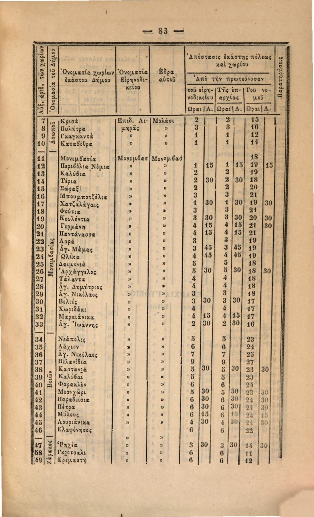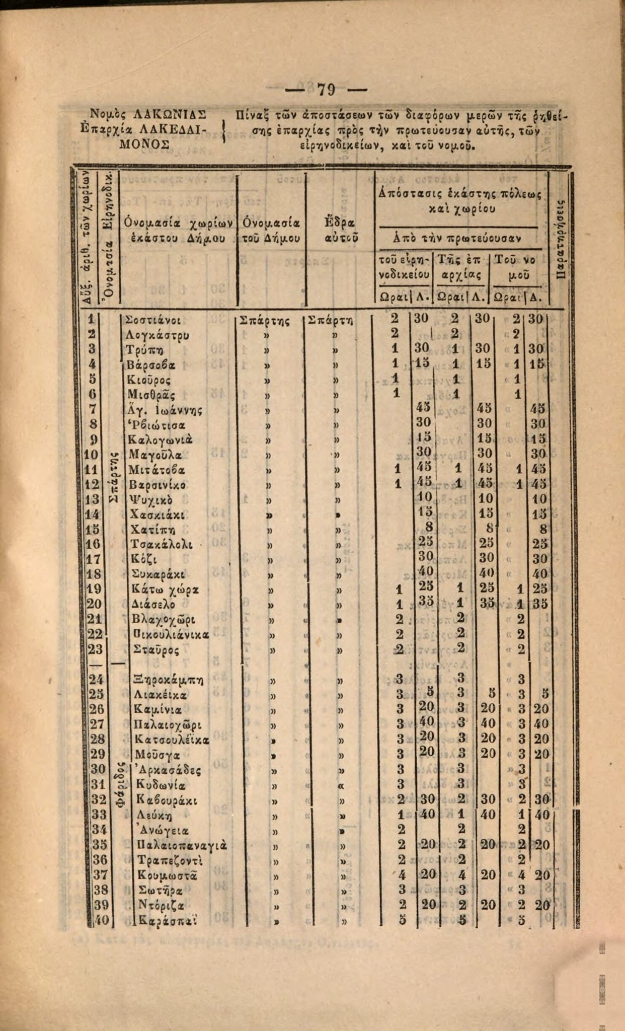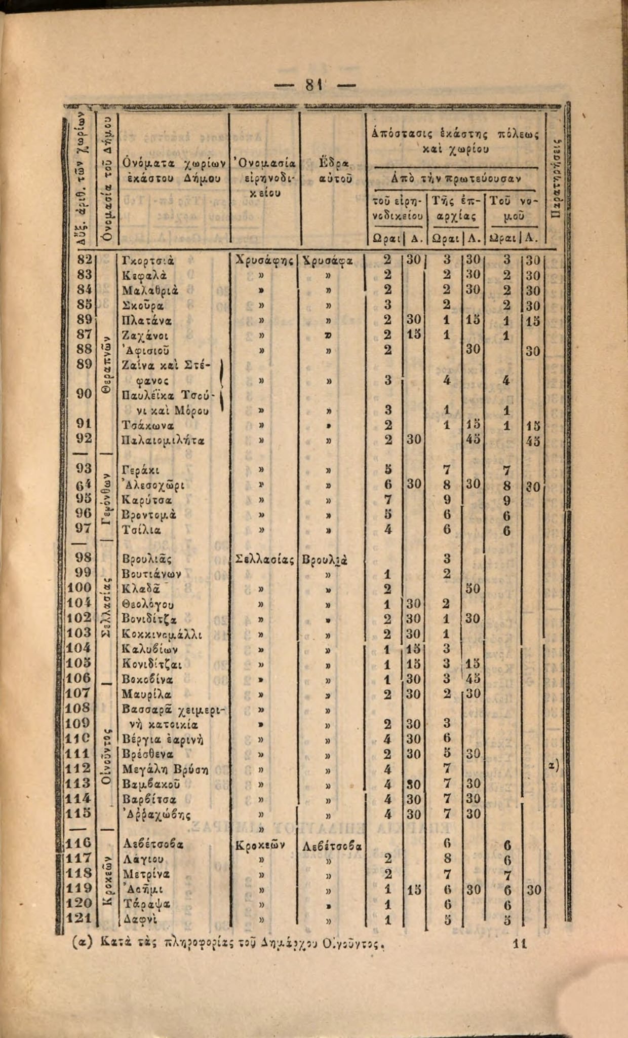 Πίναξ τῶν ἀποστάσεων τῶν διαφόρων μερῶν τῆς ῥηθείσης ἐπαρχίας πρὸς τὴν πρωτεύουσαν αὐτῆς, τῶν εἰρηνοδικείων, καὶ τοῦ νομοῦ.
