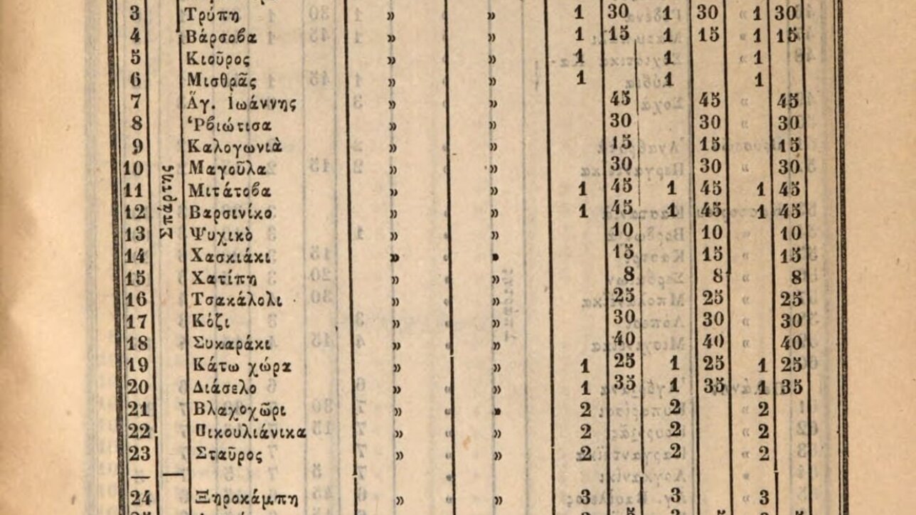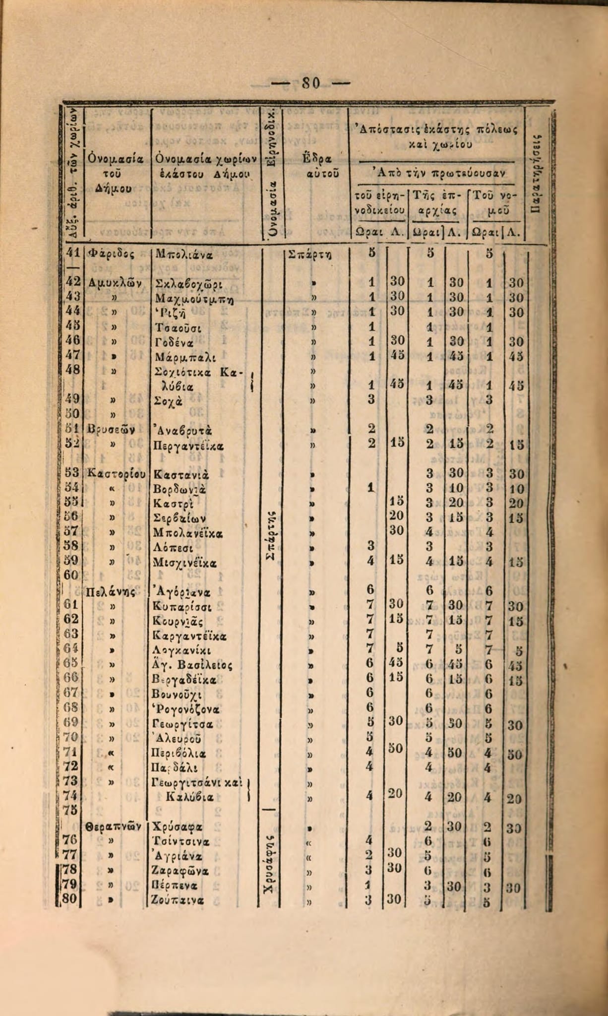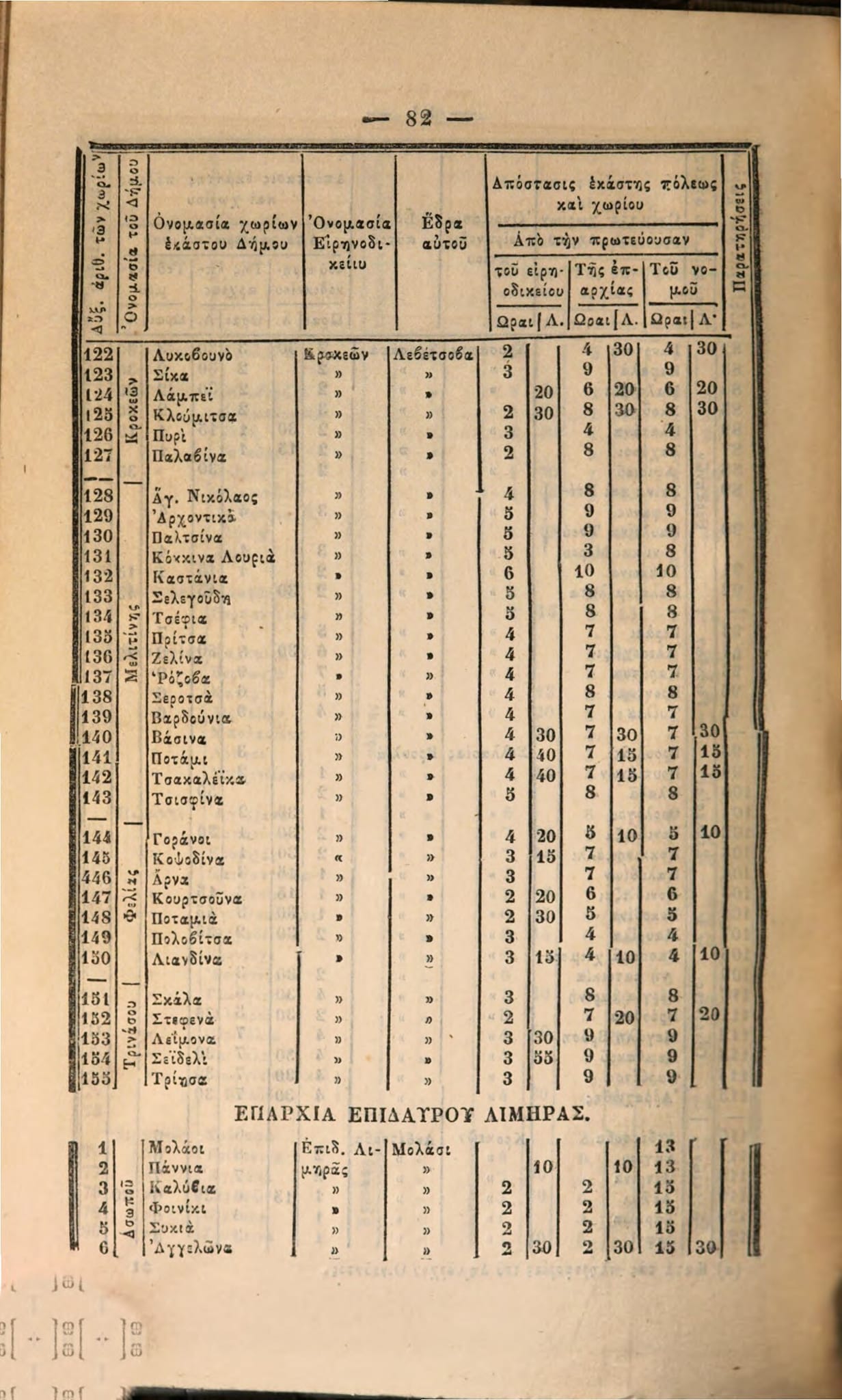 Πίναξ τῶν ἀποστάσεων τῶν διαφόρων μερῶν τῆς ῥηθείσης ἐπαρχίας πρὸς τὴν πρωτεύουσαν αὐτῆς, τῶν εἰρηνοδικείων, καὶ τοῦ νομοῦ.