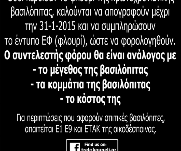 Uncategorized 01 Ιαν 2015 Ο Έξωραΐστικος Πολιτιστικός Σύλλογος Αγοριανης ανακοινώνει πως η γιορτή κοπής τη… Ο Έξωραΐστικος Πολιτιστικός Σύλλογος Αγοριανης ανακοινώνει πως η γιορτή κοπής της πίτας αναβάλλεται για εντός του μηνός Ιανουαρίου λόγω ακατάλληλων καιρικών συνθηκών και υψηλής επικινδυνοτητας για ατυχήματα στο δρόμο, για… admin